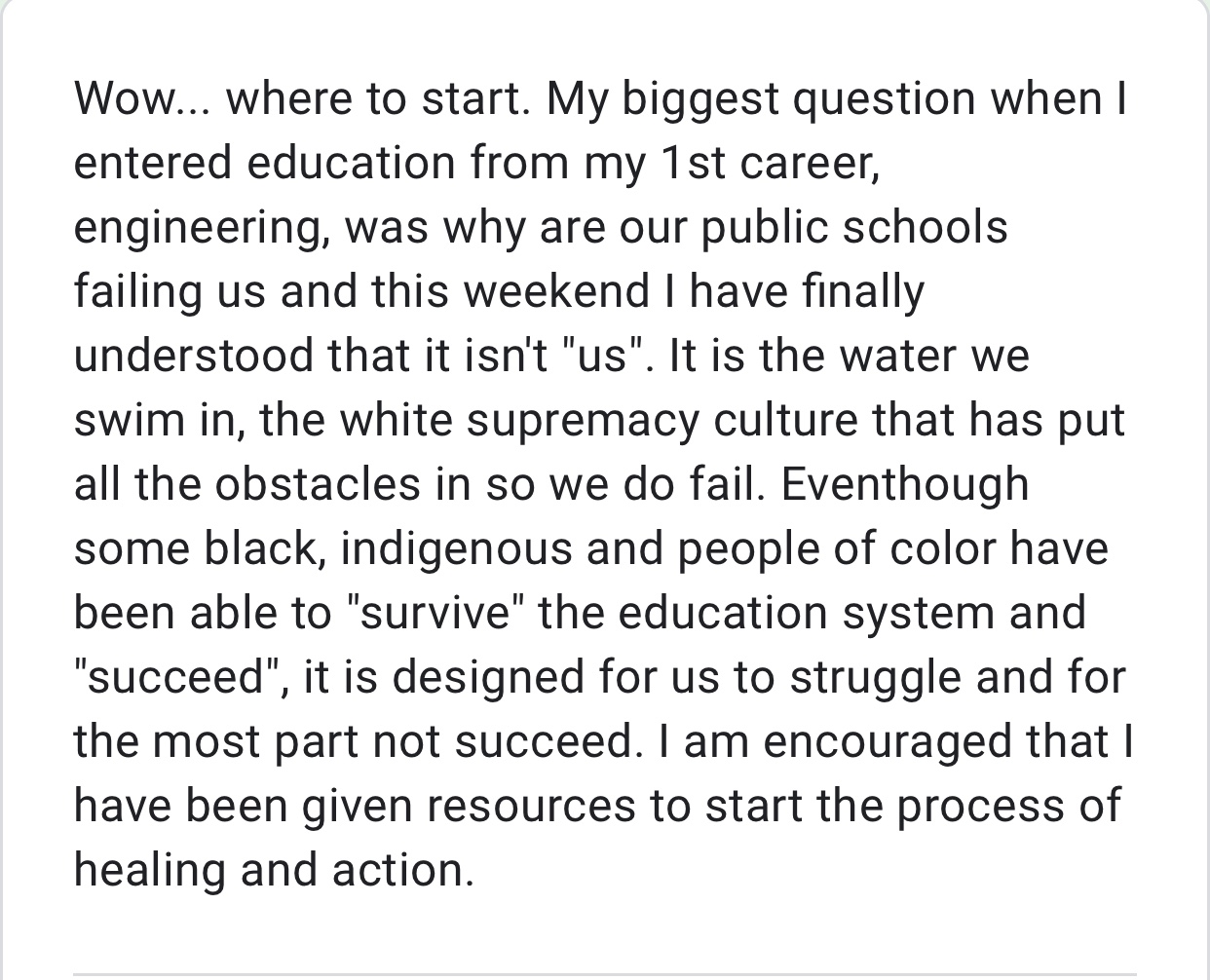 Black people are being murdered by the police (STILL), the corona virus is disproportionately affecting brown people, and even more inequities were exposed through “distance learning.” The masses of people are starting to wake up the reality that what oppressed people have know all along. The system is racist and it is broken. It will take us working together to start thinking about how to fix it.