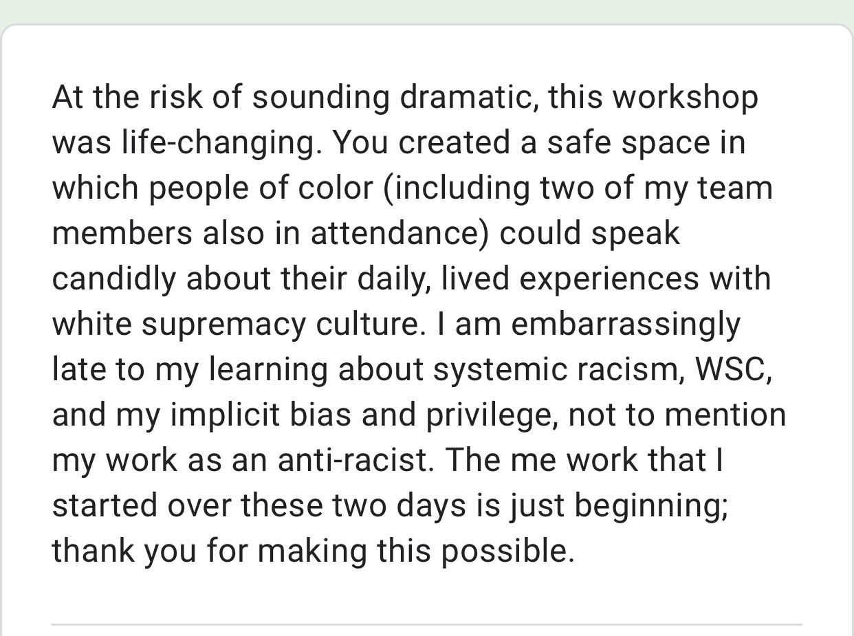 I have now offered my foundational workshop 20 times, to over 4000 educators, in 10 countries. Everyone can’t make it to San Francisco or contract me to come to them. So I have created a virtual worksop. Sign up to connect with like minded anti-racist educators who want to work to dismantle White Supremacy Culture in all our schools.